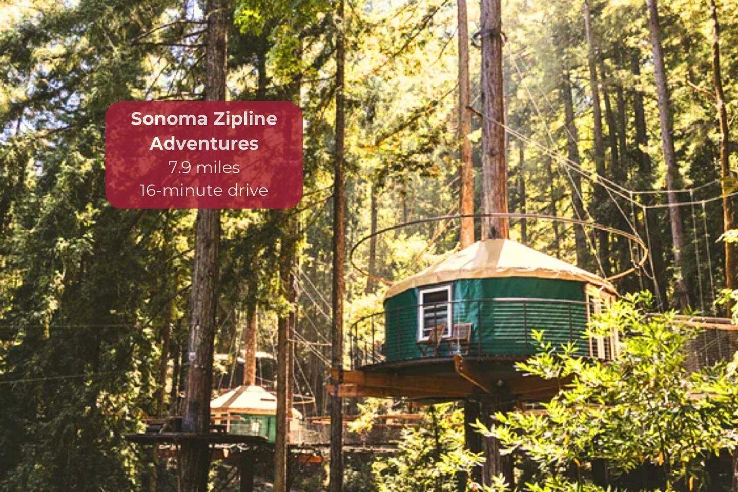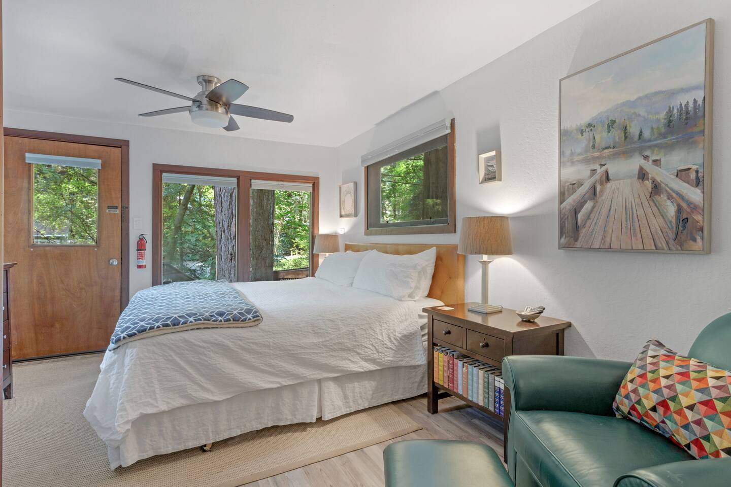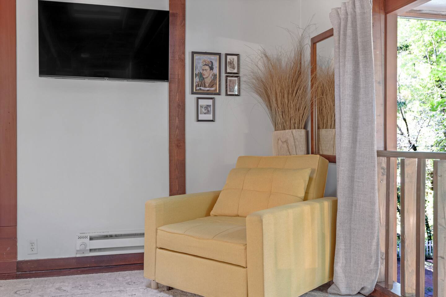 Cabana Del Rio, by Vinifera Homes, feels like a deep breath of fresh forest air. Surrounded by trees and soft birdsong, it’s a cozy place to reconnect with yourself, your people, and the rhythm of nature. Whether you’re planning a quiet weekend or a laid-back adventure, this home makes it easy to feel grounded and at ease. The heart of the home is a cozy open-concept space where expansive windows welcome in the sunlight and views of the surrounding forest. The propane heater keeps things toasty when it’s chilly out, creating the perfect space for coffee in the morning or a movie night after a day by the river. On the main level, you'll find a restful bedroom with a king-size bed. Upstairs, a lofted second bedroom offers a queen bed and a cozy chair that converts into a single sleeper. It’s great for families, friends, or couples who want a bit of extra space. The kitchen is fully equipped with a full-sized fridge, stovetop oven, microwave, and all the essentials for cooking at home—whether it’s a full dinner or just wine country snacks between tasting. If you need to catch up on some work, a dedicated workspace with a monitor is available for your use. The best thing about this is that your home office space faces the tranquil forest. Here you’ll experience what work-life balance truly means! The back deck will definitely entice you to spend your whole stay there. It’s private and peaceful, with a grill for casual meals or steak night, a firepit table that’s perfect for s’mores, and just enough space to stretch out and relax. At night, the hot tub under the trees is the perfect spot to soak and recharge. “This Home was absolutely amazing, me & my husband spent our 1 year wedding anniversary here just for the weekend. Was very peaceful, Hot tub was the best part! The redwoods surrounding the home was very nice & to hear the sounds of the creek flowing, while sitting on the deck relaxing was the best part.” - Athena Located 3-mins from downtown Guerneville, you’ll have easy access to restaurants, shops, and river adventures. Armstrong Redwoods State Reserve is only 7 minutes away for hikes beneath towering trees, and the surrounding area is filled with wineries like the Korbel Champagne Cellars,and Porter-Bass Vineyard & Winery. The Bohemian Highway offers one of the most scenic drives in Sonoma County—perfect for a lazy afternoon of winding roads and redwood views. Even though the home feels tucked away, it’s in a convenient spot. You’re close to it all but just far enough to enjoy the quiet. You can walk about half a mile to local tennis, pickleball, and basketball courts if you're in the mood for something active. **Highlights** - Towering redwoods surrounding the home - Large windows to frame the serene forest - BBQ grill with utensils and complimentary propane - A firepit to keep you warm while stargazing on the balcony. A little tip: Bring some marshmallows for a smore's night! - A dedicated workspace with a monitor - just connect your laptop! - Secluded location, yet minutes from downtown Guerneville - Private hot tub under the trees with partial cover - There are a selection of games and books for you to enjoy while you are here. - Privacy blinds in each room Whether you’re enjoying a glass of wine on the deck, dipping into the hot tub under the stars, or curling up with a movie after a day at the river, Cabana Del Rio is the kind of place that stays with you. If you’re craving calm, comfort, and connection, this redwood retreat is waiting for you. “Great place nestled in the woods by a beautiful creek! The pictures don't do it justice, that's for sure! You're close to other houses but you do feel tucked and out of the way. Coffee on the porch with the fire table on listening to the birds and the creek was amazing.” - Idona ✨ Optional Trip Planning ✨ Want help planning your wine country getaway? We recommend working with Melanie, a local concierge who offers personalized trip planning, winery reservations, spa bookings, private chefs, and more. Melanie is a third-party provider, but we’ve worked with her for years and highly recommend her to our guests. If interested, we’ll share her contact details after you book.